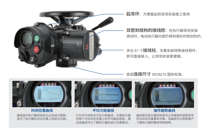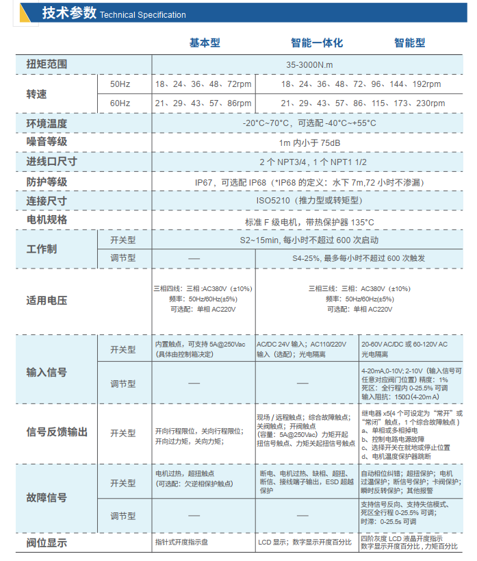 多回转电动执行器根据应用环境分为88T和88D两大系列,88T系列的直接输出力矩为35N.m~3000N.m, 输出转速18rpm~192rpm范围内可选;88D系列可直接输出50N.m~900N.m的力矩,输出转速18rpm~144rpm范围内可选。这 两个系列的产品根据功能配置的不同又分为基本型、智能 一体化及智能型三种。 88系列多回转系列电动执行器具有安全、稳定、可靠的特点,能够满足不同领域的应用,定制化服务可满足用户的各种 需求。